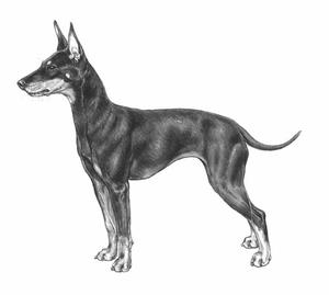 Colour Black and Tan. The black ebony, the tan likened to a new chestnut deeply rich. Colours not running or blending into each other, but meeting abruptly, forming clear and well defined lines of colour division. Forelegs tanned to knees in front. The tan then continuing inside and at back of forelegs to point just below elbows, the thin black line up each toe (pencilling) and a clearly defined black mark (thumb mark) on centre of each pastern, and under chin. Hindlegs well tanned in front and inside with black bar dividing tan at centre of lower thigh. Heavy tan on outside of hindquarters (breeching) undesirable. Muzzle well tanned. Nose black, the black continuing along top of muzzle, curving below eyes to base of throat. A tan spot above each eye and a small tan spot on each cheek. Under-jaw and throat tanned, lip line black. Hair inside ears tan (tan behind ears undesirable). Each side of chest has some tan. Vent and under root of tail, tan. White hairs forming a patch anywhere totally undesirable.